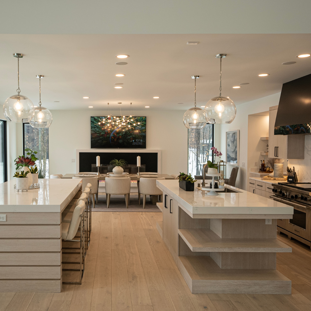 Kitchens / dining / open-concept areas. Background music that flows into adjoining spaces without wires or visible speakers.